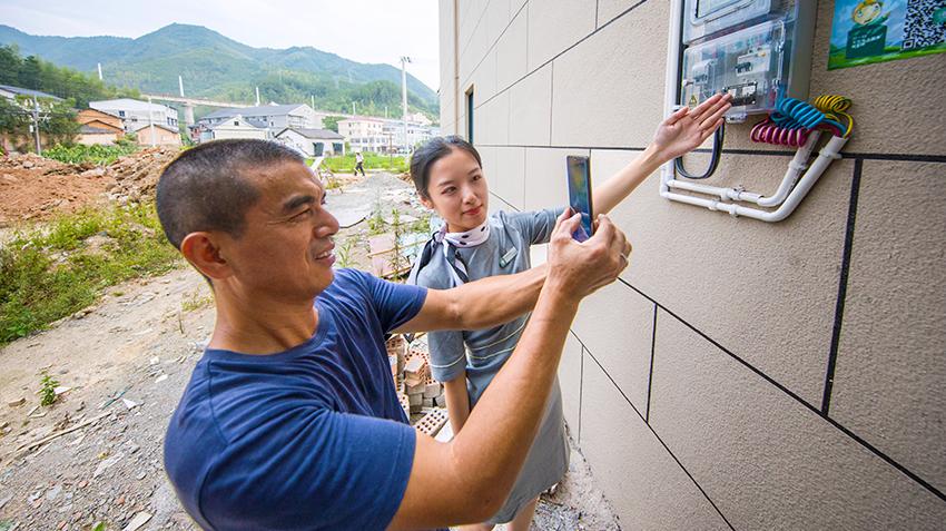 国网丽水供电公司营业厅员工为村民介绍电力二维码的用途 /徐立仁 摄
