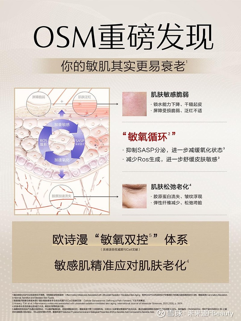 国际细胞衰老学会在知名期刊《Cell》发表的《Cellular Senescence:Defining a Path Forward》中指出,衰老因子SASP大量分泌,在诱发炎症因子、加剧肌肤敏感反应的同时,与氧自由基彼此促进生成,进一步加速老化暗沉。因此通过抑制SASP衰老因子分泌、减少活性氧生成,来打破「敏氧」循环的关键,是改善敏肌易老问题的关键 。