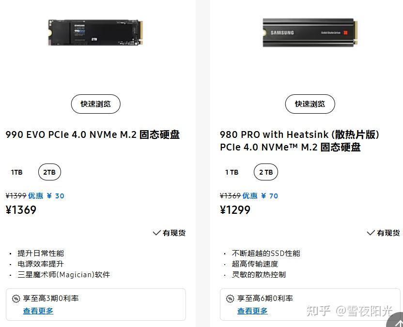 图片截自三星官网一方面990 EVO的定价颇高,另一方面适配PCIe5.0*2接口的特点目前又比较鸡肋(可能以后PCIe5.0*2接口的主板多了之后会更有用),因此990 EVO在2024年年初上市后被数码圈戏称为“战未来”的产品。