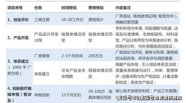 对于资金投入,并未严格细化。但可粗算下:工商注册费用可忽略不计;研发投入需结合具体产品和团队,难以预估。但以5人的研发团队计算,人力资源成本约100万/年。厂房建立涉及厂房装修和后期体系建设。厂房装修和租赁费用,以1000平米计算,装修约200万人民币。租金按照30元/平米/月计算,一年就是36万,加上水电物业将近50万。质量体系建设是个系统工作,涉及产品的全生命周期,费用简单预估50万左右。注册检测不收费,若产品免临床也不产生费用,做临床的话根据产品而定,十几万至几千万都有可能。国产III类产品首次注册费用为15.36万,II类产品首次注册费用则由各省级价格、财政部门制定。以浙江省为例,II类产品首次注册费用6.57万元。