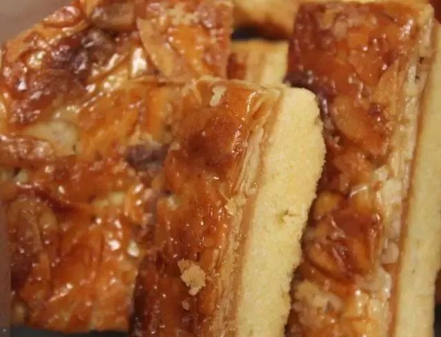 面包片制成,黄油和糖烘烤得干硬脆香,咬下去硬邦邦的,可是立刻就能感觉出舌尖香浓融化的美妙。吃一口嘴巴很邋遢,垫张纸面包屑还舍不得扔,一股脑地倒进嘴里。