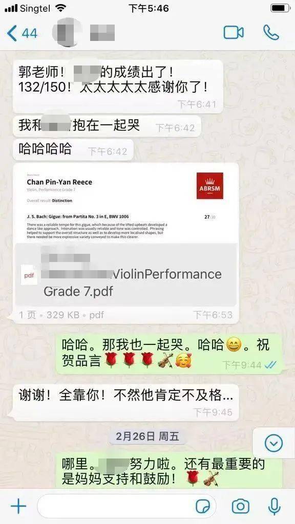 多年跟随郭岚学习小提琴的学生,在2021年英皇考到7级的Distinction,也让家长激动不已。