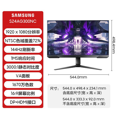 三星(SAMSUNG)24英寸 144Hz 1ms 电脑显示器屏幕 升降旋转支架三面窄边框 电竞游戏 S24AG300NC