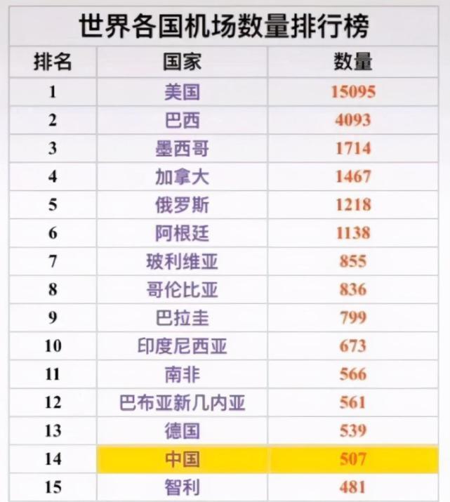 世界上机场数量排名靠前的国家,大多数地广人稀,如果修建高铁肯定不划算,因为这些国家没有庞大的人口基础,所以航空是他们发展交通的首选方式。