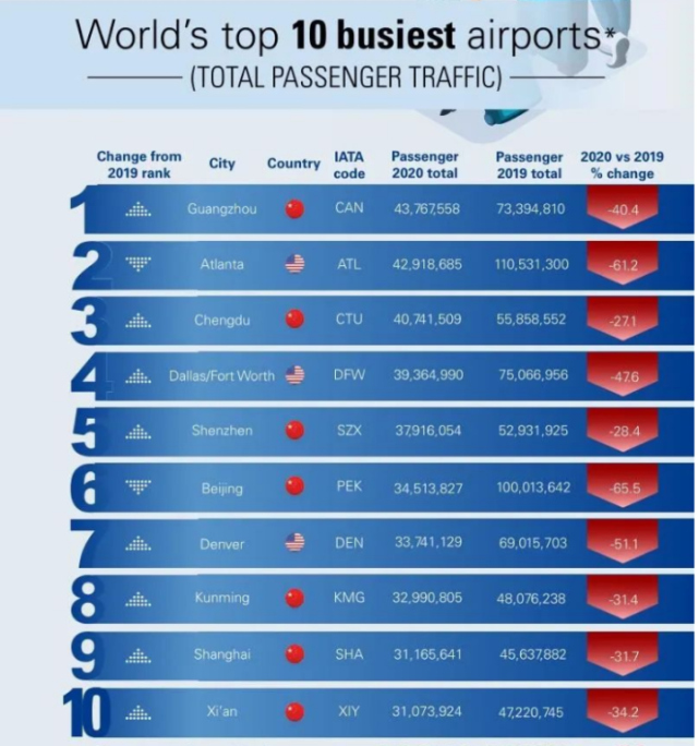 根据国际机场协会ACI公布的,2020年全球最繁忙机场排名TOP10,客流量排名前10的机场中有7个在中国,3个在美国。