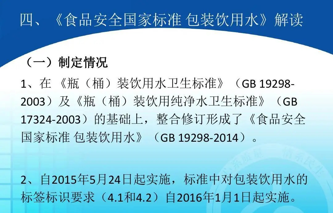 直到2015年5月24日,《食品安全国家标准包装饮用水》开始实施,规定包装饮用水的名称应当真实、科学,不得以水以外的一种或若干种成分来命名包装饮用水,庞大的家族瞬间土崩瓦解,只留下纯净饮用水和矿物质饮用水两类。