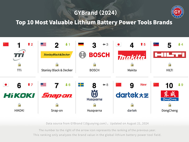 8月21日,GYBrand发布了2024年度全球锂电电动工具品牌价值10强排行榜(The World’s Top 10 Most Valuable Lithium Battery Power Tools Brands of 2024)。其中,创科实业(TTi)蝉联“全球最具价值锂电电动工具品牌”,史丹利百得(Stanley Black & Decker)位居次席,博世(BOSCH)排名第三,大艺科技、东成分列九至十名。前十名单中,中国占据3席,美国和日本各占2席,德国、列支敦士登和瑞典各占1席。
