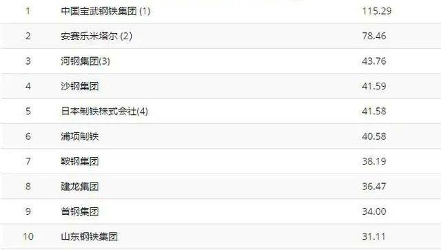 世界十大钢铁集团的排名公布