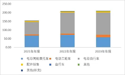 爱玛科技——23年营业构成中,电动自行车占比61.12%,电动两轮摩托车27.63%、电动三轮车6.83%、配件3.08%。