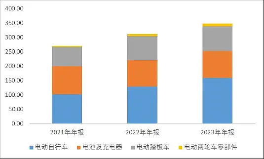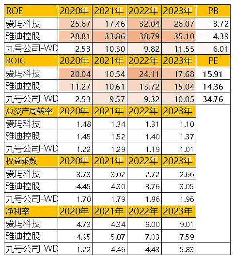 从2023年收入体量来看,雅迪控股(347.63亿元)>爱玛科技(210.36亿元)>九号公司(102.22亿元)。