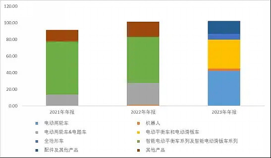 九号公司——早期以滑板车业务为主,现拓展至电动两轮车/全地形车/割草机器人等。23年营业构成中电动两轮车41.40%、电动平衡车和电动滑板车34.12%、配件及其他15.18%、全地形车6.83%。