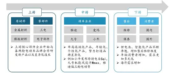 下游——销售环节,主要包括直营、经销及电商平台三个渠道。终端客户可分为C端和B端用户,B端用户主要包括共享电动车、外卖电动车。