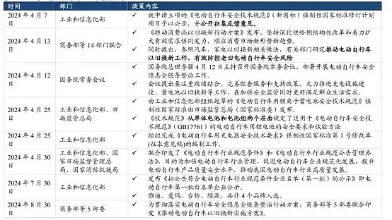 2024年初南京发生的电动自行车起火事件引起监管高度重视,之后到24H1,工业和信息化部、国家市场监督管理总局和国家消防救援局联合发布《电动自行车行业规范条件》和《电动自行车行业规范公告管理办法》,以及国家市场监督管理总局出台的《电动自行车用锂离子蓄电池安全技术规范》,对行业生产标准和锂电池使用标准等提出了更高的安全要求。