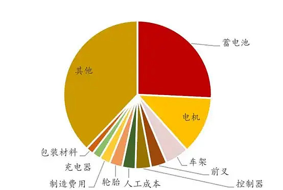 成本构成的角度,电动两轮车制造属性较强,直接材料占比较高,爱玛科技直接材料占比常年维持在90%以上,且近年来有逐步提升趋势。电装部件为其核心成本构成,其中蓄电池占据成本比例高,达到23%,电机占据12%成本,二者合计占比四成,其余成本主要来自车架、控制器、轮胎等,较为分散。