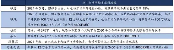 2022 年来,东南亚各国政府纷纷推出油改电相关政策,从电动两轮车购车补贴、个税减免、限摩令等方面推进摩托车电动化,如越南政府直接规定 2030 年后河内、胡志明市、海防、岘港和芹苴 5 个大城市限行或禁止摩托车;泰国、印尼、马来西亚、菲律宾政府均消费者提供电动两轮车购置现金补贴,泰国单车补贴比例达 12%。