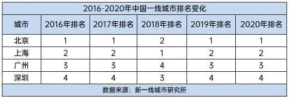 一线城市的排名,相比去年并没有变化,依旧是:北京、上海、广州、深圳。