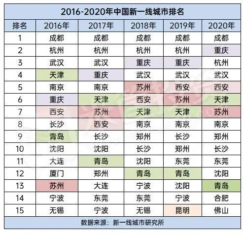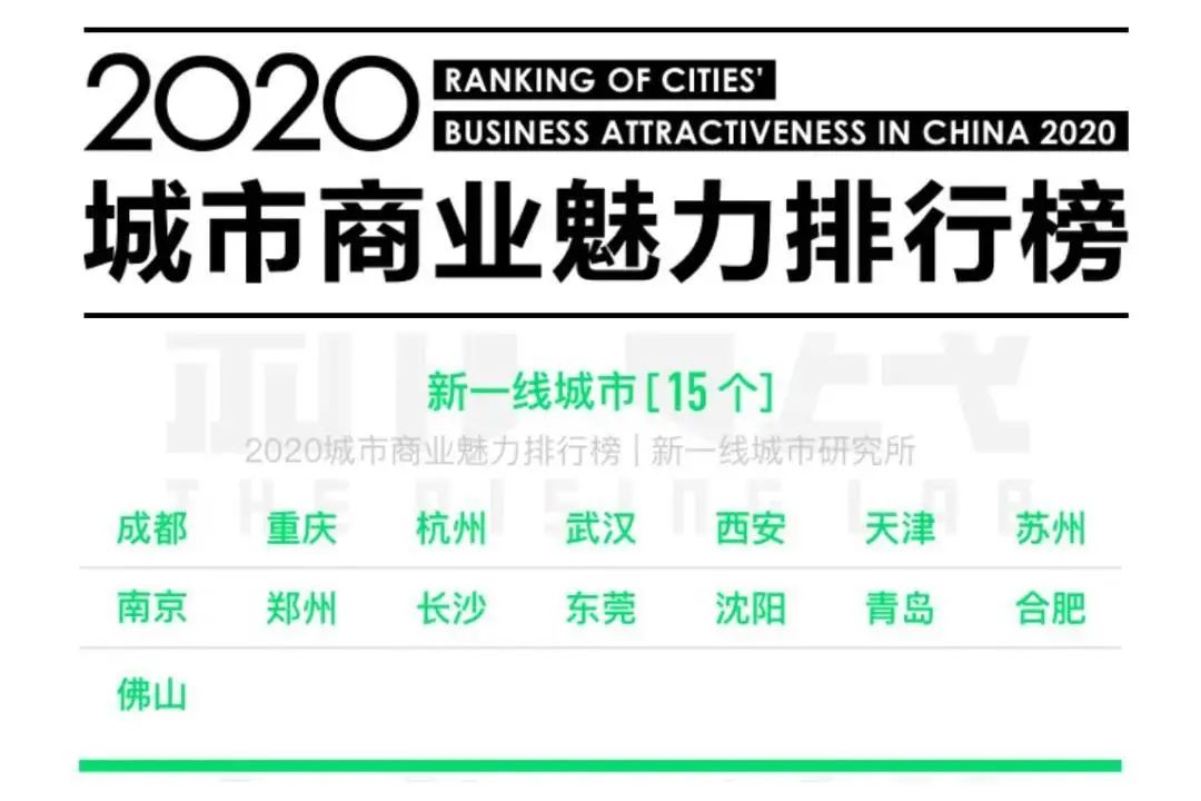 2020年版的15个新一线城市:成都、重庆、杭州、武汉、西安、天津、苏州、南京、郑州、长沙、东莞、沈阳、青岛、合肥、佛山。与2019年相比,15个城市排名变化不小。