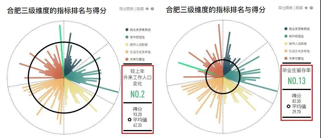 其中,城市人活跃度是合肥今年表现最好的维度。尤其是外来人口较去年的增长指数,在全部城市中排名第二。毕业生留存率的表现,也能排在全国13位。
