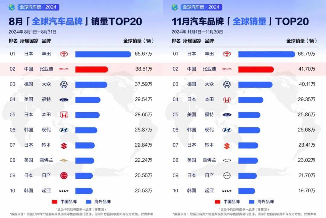 公开数据显示,比亚迪在2024年8月和11月均超越大众,一度跃居全球汽车销量排行榜第二位。要知道,“榜上”车企的全球销量数据, 除比亚迪外,其余都是“油”和“电”车型的混合,而且还是以传统燃油车为主,新能源汽车的销量数据惨不忍睹。