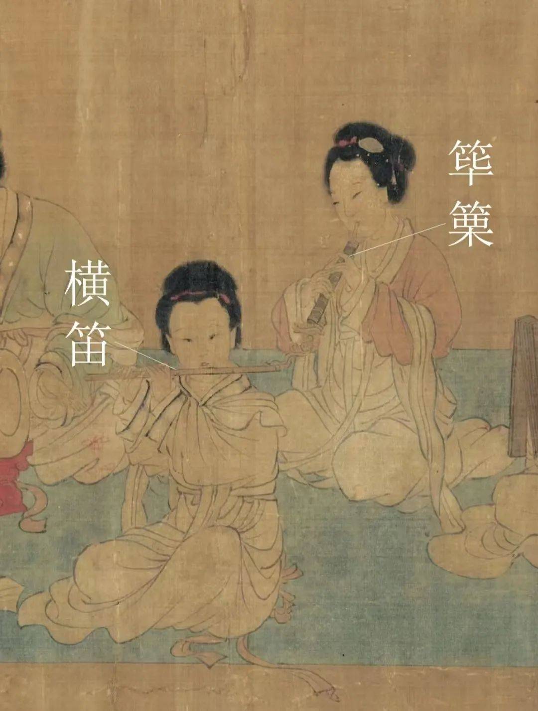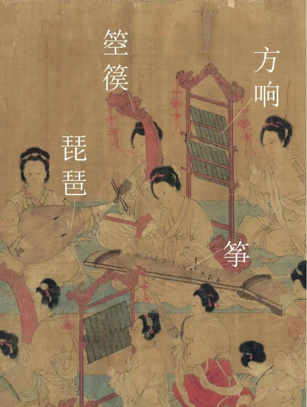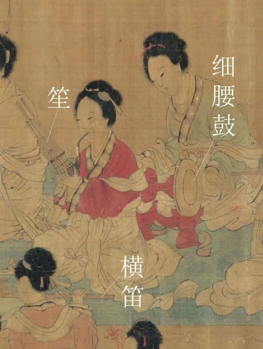 画中描绘了一个十九人演出阵容,十一种乐器分为两组: