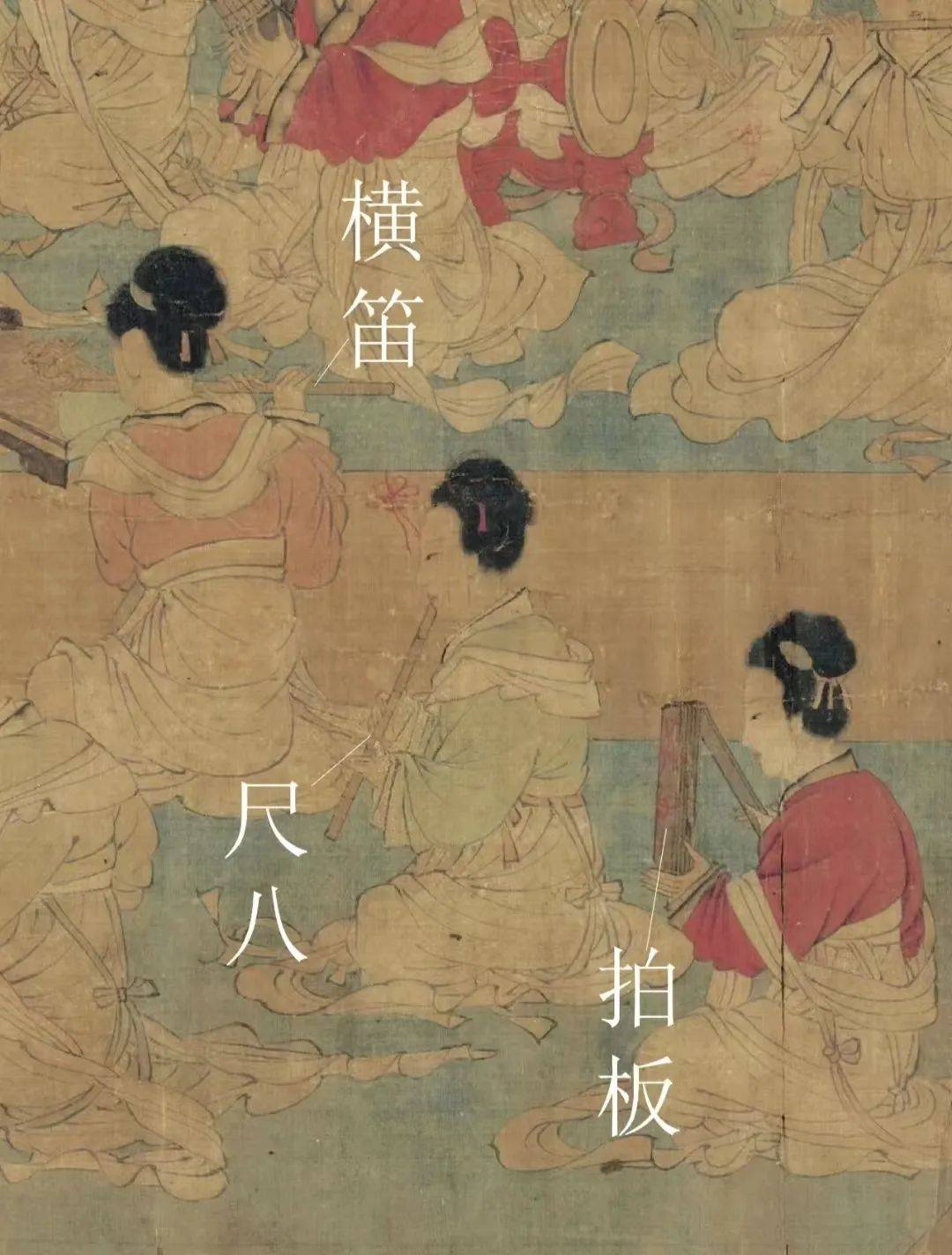 一组所执乐器依次为琵琶、箜篌、筝、方响、笙、细腰鼓、横笛、尺八、拍板;