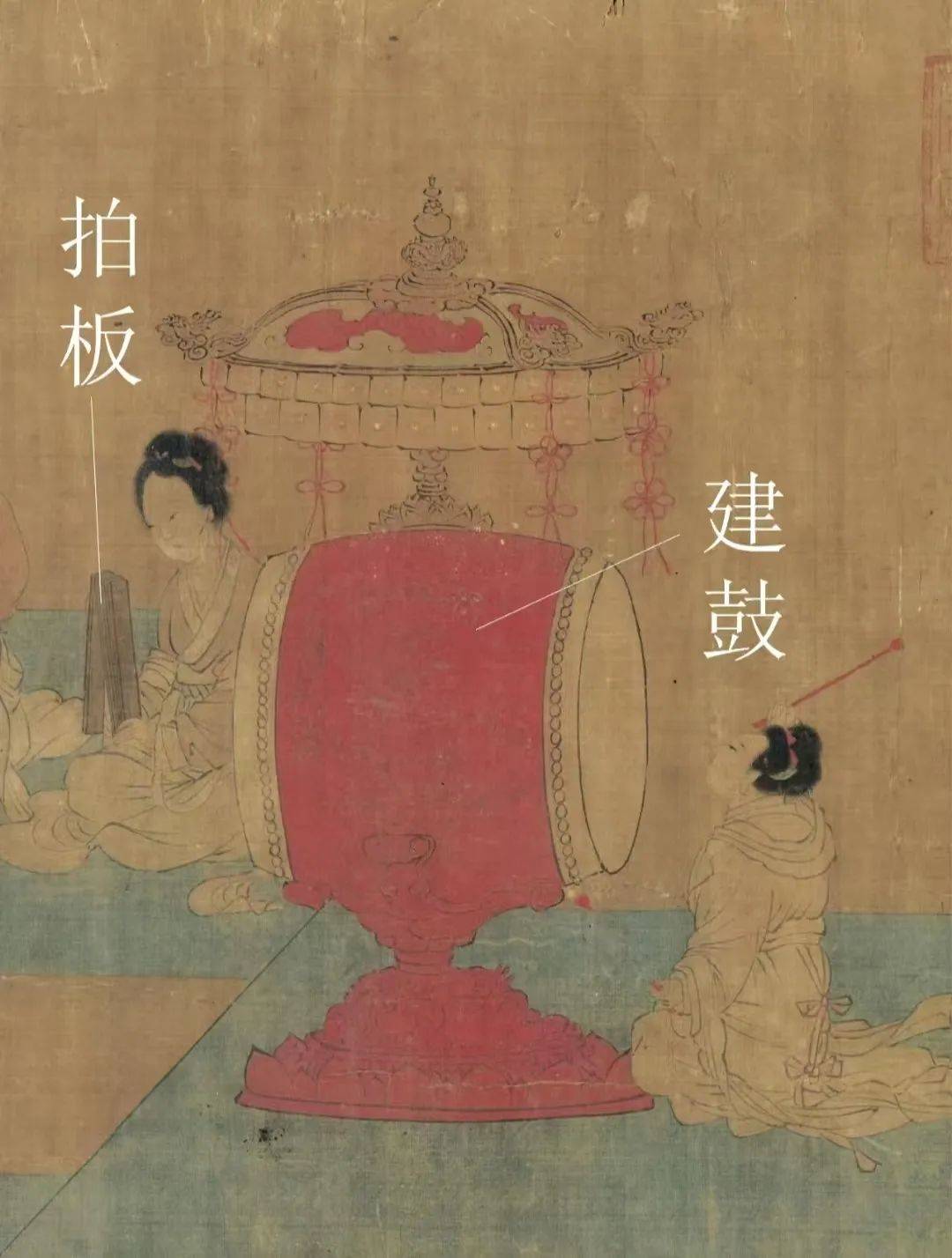 队尾居中处置建鼓,上有宝盖,下有雕座,击鼓者跪于鼓后作援枹欲击。