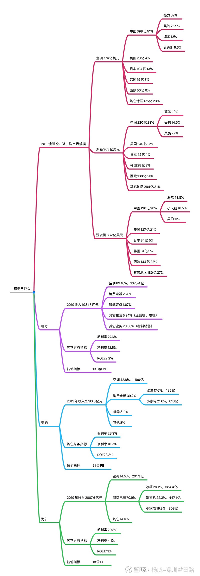 综上,格力在空调上龙头优势明显,新零售转型需加强,冰洗和小家电多元化布局需奋起直追;美的在空调、冰洗和小家电多元化布局上较为扎实稳健,在空调上想要进一步抢占格力市场份额难度较大,冰洗和小家电可能未来面临格力大反攻,冰洗海尔品牌优势和市占率更显著;海尔在全球化、高端化战略上做的最好,但在空调上竞争力较弱,冰洗和小家电可能未来同样面临格力反击,小家电美的优势较为明显。