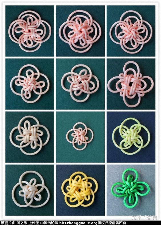 图片自上而下依次为酢酱草结、盘长结、团锦结、星辰结、吉祥结。来源 陈夏生《中国结3》2. 由单结构成的绳结