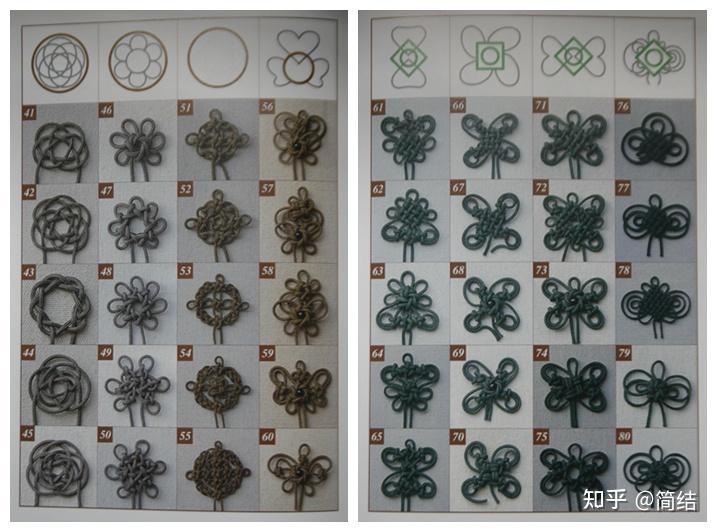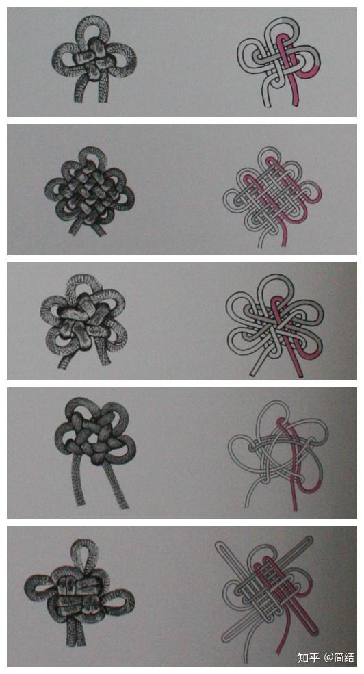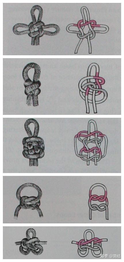 图片自上而下依次为万字结,双联结,藻井结,平结,攀援结。图片来源 陈夏生《中国结3》3.由平面线圈挑压构成的绳结