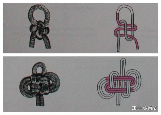 图片自上而下依次为双钱结,纽扣结。图片来源 陈夏生《中国结3》4.由半耳翼绳套构成的绳结