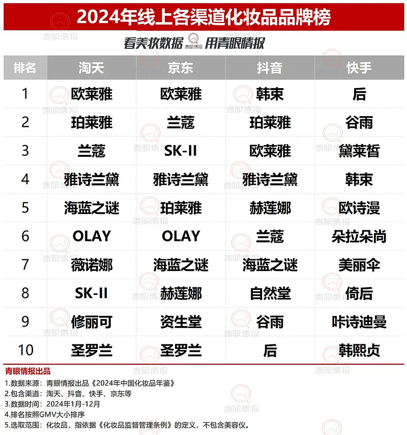 青眼情报发布2024年全网化妆品品牌榜,该榜单涵盖淘天、抖音、快手、京东等主流电商平台数据。(数据来自青眼情报出品的《2024年中国化妆品年鉴》)