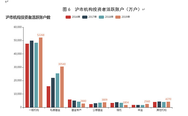 根据上交所数据,2019年沪市专业机构投资者交易意愿上升,机构投资者活跃账户数为9.8万户,较2018年增加8%,增长幅度高于个人投资者。年金、社保和券商自营活跃账户数增加幅度最高,分别为45%、32%和28%。
