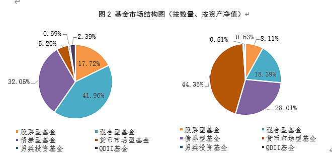 基金市场结构来看,从数量看,数量最多的基金类型为混合型基金(41.96%)、债券型基金(32.05%)、股票型基金(17.72%);从资产净值来看,规模最大的基金类型为货币型基金(44.35%)、债券型基金(28.01%)、混合型基金(18.39%)。