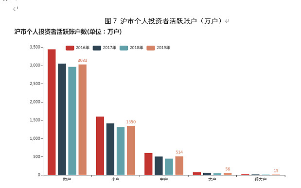 中户以上个人投资者交易意愿上升。2019年个人投资者活跃账户数为4970.5万户,较2018年增加3.6%。活跃账户增加幅度由高到低依次为中户、大户、超大户、小户和散户。中户和大户的活跃账户增加幅度均在10%左右,交易意愿的提升远高于其他类别个人投资者。