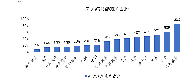 新入市投资者交易意愿大幅提升。2019年新入市投资者为1399.9万户,低于2018年。新入市投资者中活跃账户达360.9万户,占比25.8%,较2018年10%的水平大幅增加。