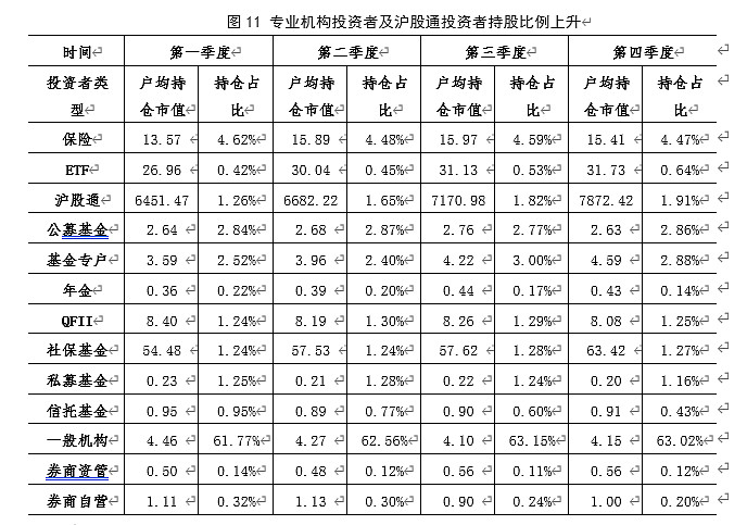 中户以上个人投资者持股比例上升。年末个人投资者持股比例较上一年年末上升1个百分点,其中中户以上个人投资者持股比例上升,散户和小户持股比例有所下降。中户、大户和超大户个人投资者持股比例分别上升0.22、0.16、1.19个百分点。