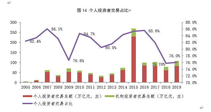 从个人投资者交易占比来看,2009年起占比逐步攀升,2016年起大幅下降。2019年个人投资者交易占比76%,较2018年略有上升。