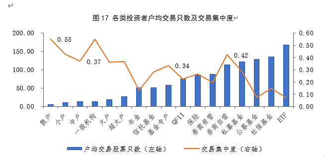 个人投资者和券商自营交易较为集中。个人投资者交易股票只数随资产规模的上升而递增,散户约6只,超大户约27只。机构投资者中,社保基金和公募基金交易股票只数较多,均超过120只。券商自营的交易集中度为0.42,表明其交易的股票只数虽多,但大多交易集中在少数股票上。
