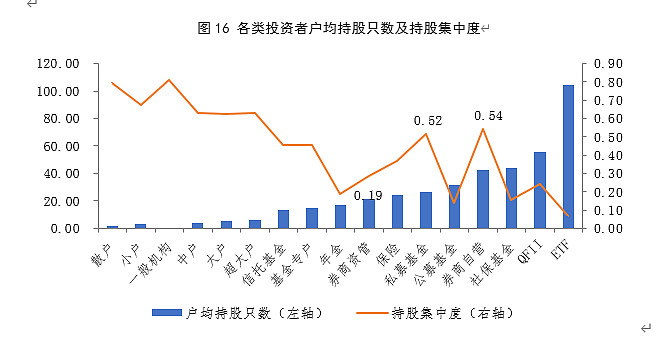 QFII、社保基金和券商自营持股只数相对较高,户均持股均在40只以上。私募基金和券商自营两类投资者持仓股票只数多,但往往选择重仓几只股票,使其同样容易受到个股波动的影响,无法真正起到风险分散的作用。