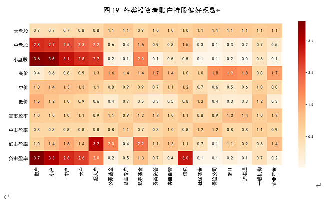 交易风格来看,中小散户和机构投资者交易风格迥异。中小散户更偏好交易小盘股,机构投资者则偏好交易大盘股。散户喜欢扎堆在绩差股上,机构投资者则偏好交易中高市盈率的股票,几乎不交易业绩亏损的股票。小户和散户受制于资金量更多交易低价股,机构投资者则偏好交易高价股。