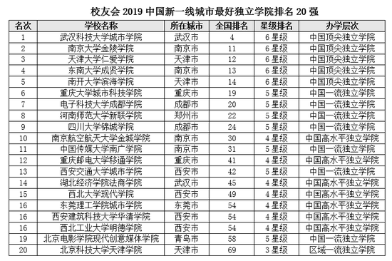 在最新艾瑞深中国校友会网2019中国大学排名中,华南理工大学广州学院、中山大学南方学院、中山大学新华学院、广东财经大学华商学院、广东技术师范学院天河学院雄居校友会2019中国一线城市最好独立学院排名前5强。武汉科技大学城市学院、南京大学金陵学院、天津大学(分数线,专业设置)仁爱学院、东南大学成贤学院、南开大学(分数线,专业设置)滨海学院雄居校友会2019中国新一线城市最好独立学院排名前5强。