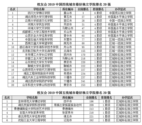 四川大学锦江学院、湖北师范大学文理学院、云南大学旅游文化学院、河南大学民生学院、河海大学文天学院雄居校友会2019中国四线城市最好独立学院排名前5强。吉林师范大学博达学院、湖北民族学院科技学院、景德镇陶瓷大学科技艺术学院、吉首大学张家界学院、淮北师范大学信息学院雄居校友会2019中国五线城市最好独立学院排名前5强。