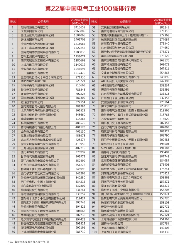 论坛期间,备受关注的《第22届中国电气工业100强研究报告》正式发布,并公布了电气工业百强名单。