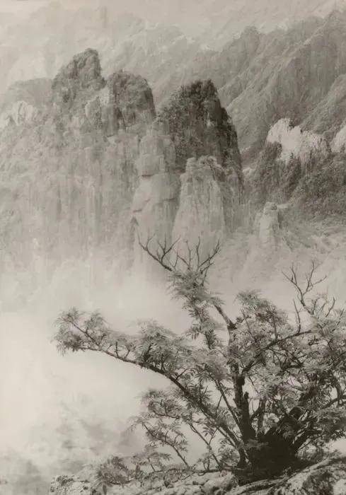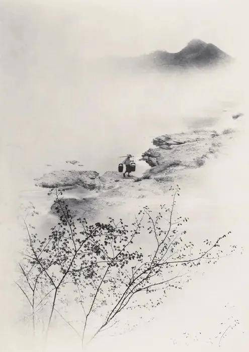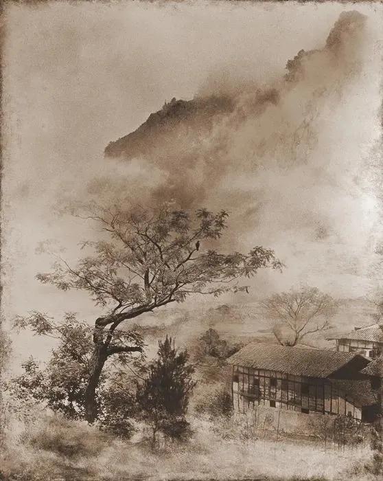 将不同的底片通过暗房技术遮挡、拼接、缩放,最终创作出具有中国水墨画韵味的风光照片,自成一种超凡、仙逸的风格。