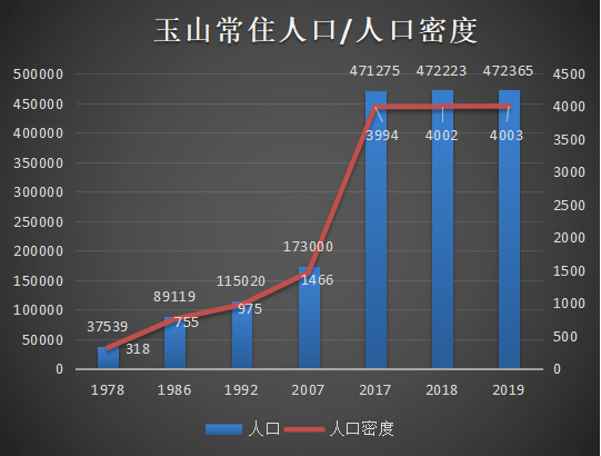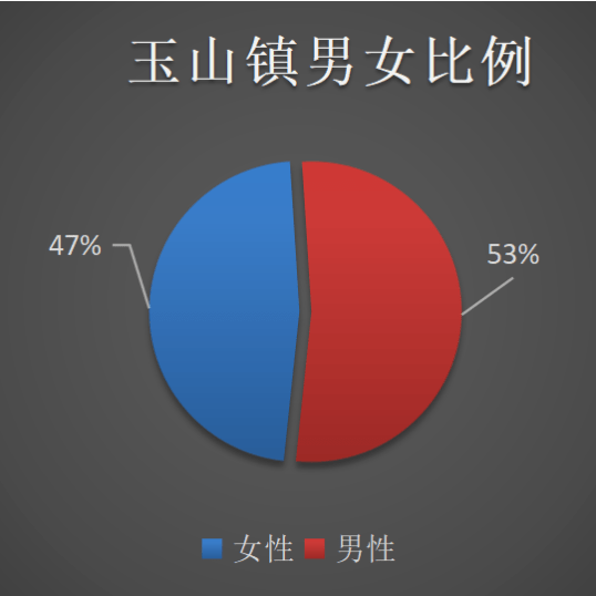 玉山镇男女比例较均衡,2019年常住人口472365人,其中女性222012人、男性250353人。