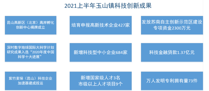 科技金融贷款1.37亿元,位列全市第一、发放2020年度苏南自主创新示范区建设专项资金2300万元,惠及企业72家、新增产学研项目超40个、“昆山市移动物联网创新园”获批国家级科技企业孵化器。