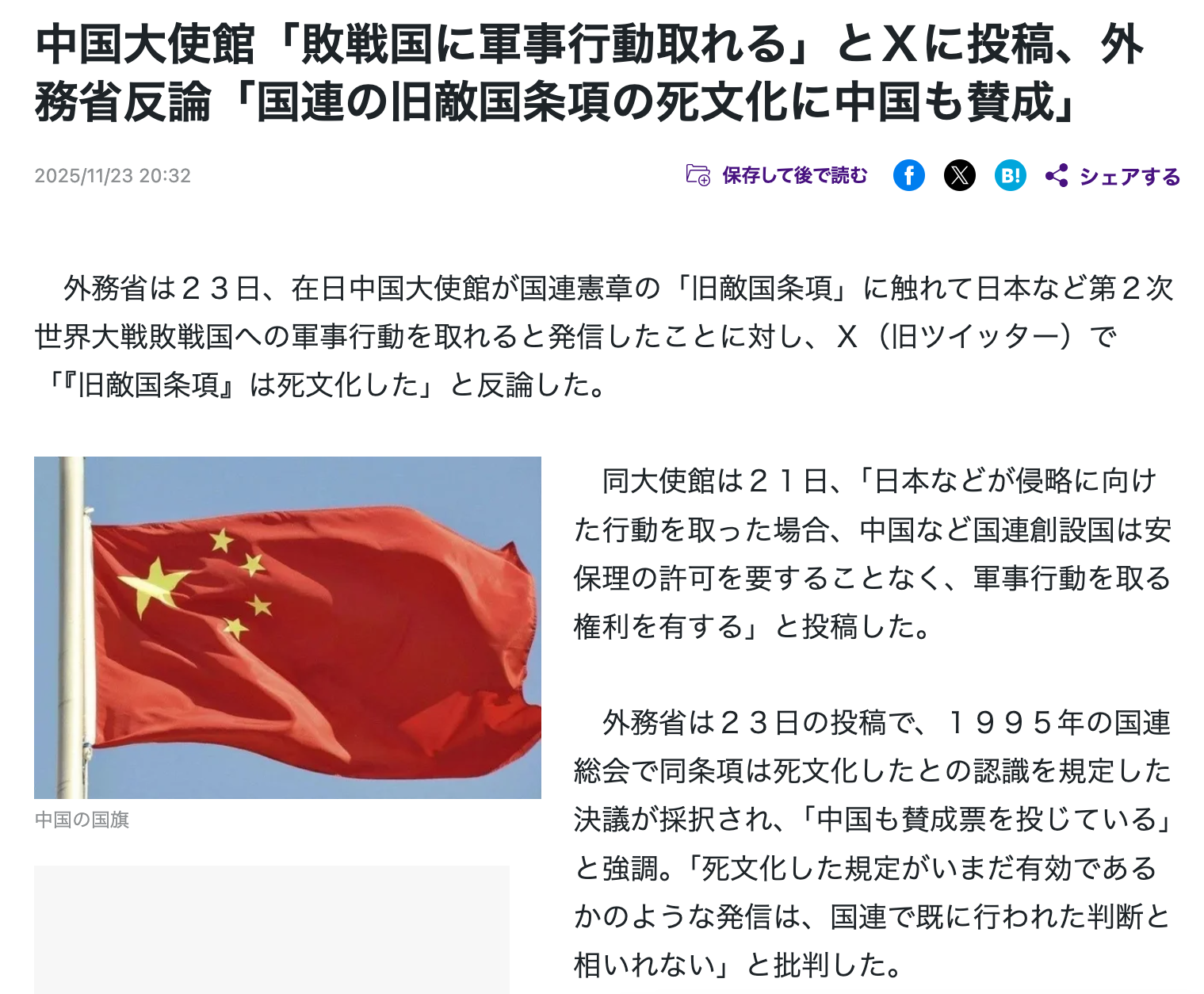 日本外务省二十三日在X上反驳称,“‘旧敌国条款’已失效”。这一表态针对的是中国驻日大使馆此前有关 “依据《联合国宪章》‘旧敌国条款’,可对日本等第二次世界大战战败国采取军事行动” 的相关表述。中国驻日大使馆曾于二十一日发文称,“若日本等国采取侵略行径,中、美、英、苏等联合国创始国无需联合国安理会许可,有权采取军事行动”。外务省在二十三日的发文中标注,一九九五年联合国大会通过决议,明确认定该条款已失效,“中国当时也投了赞成票”。外务省批评道,“将已失效的规定表述为仍具效力,这与联合国已作出的判断相悖”。