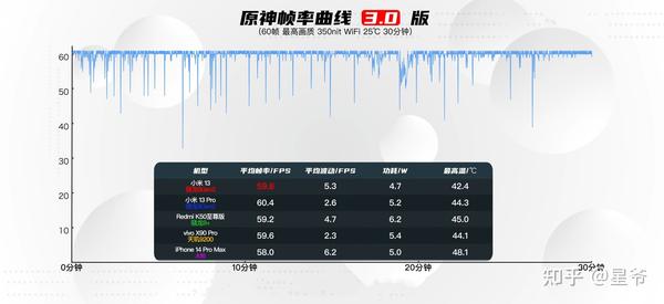 图片数据来源:极客湾2.3 骁龙8+ Gen1以及骁龙8 Gen1游戏性能实测表现《原神》是一款最考验配置的游戏。以最高画质60帧玩《原神》,搭载骁龙8 Gen2处理器的小米13,平均帧率59.8帧,基本接近满帧运行,功耗4.7W,超越了最强的A16处理器功耗表现,机身最高温度也仅为42.4℃。