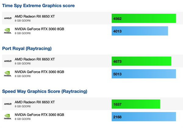大众性价比系列::盈通(yeston)AMD RADEON RX 6650XT 8G D6 大地之神AMD的RX 6650XT游戏性能是对标RTX3060 8GB版的,在3DMark测试中两者互有胜负。