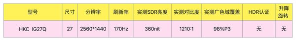 HKC今年真的是太卷了,原来是1300左右价位的机型直接干到了800多,HKC IG27Q采用了的是 Fast IPS面板,素质非常不错,是同价位为数不多能超频到170Hz刷新率的显示器面板。拥有2K分辨率+170Hz刷新率,能够满足大部分游戏玩家的需求。实测还拥有100%sRGB和98%DCI-P3的超广色域(超过官方宣传的90%DCI-P3色域覆盖),能够呈现更鲜艳、更细腻、更接近真实的色彩效果。底座造型采用多边形设计,相比三叉型底座来说拥有良好稳定性的同时占地面积小。可以为鼠标键盘等外设留出更富余的空间。不过遗憾的是这个底座不支持升降旋转调节。如果需要更多角度调节,可以通过VESA接口外接通用桌面支架。不过,800出头就能买到如此高素质的游戏显示器,还要啥自行车!如果你是一个游戏爱好者或者对广色域表现有较高要求(比如MAC系统用户),那么HKC IG27Q是一个不错的选择。